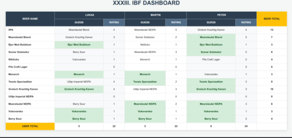 Ochutnávali sme celkovo 13 vzoriek piva. Päť pochádzalo z Holandska, dve z Islandu a šesť z Chorvátska. Už samotný geografický rozptyl naznačoval, že nás čaká pestrý večer. Aby však nešlo len o chaotické popíjanie, pripravil som webovú aplikáciu dostupnú z mobilných telefónov. Bol to prvý IBF bez použitia tabuľkového procesora. Prostredníctvom aplikácie sme tipovali a bodovali vzorky piva. Výsledky sa v reálnom čase zobrazovali na TV/webe, čo dodávalo celej akcii punc kvality.